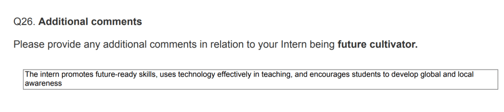 As a future cultivator, I focused on supporting children in developing skills that will benefit them beyond the classroom. During my lessons, I encouraged students to communicate their ideas, participate in discussions, and collaborate with their peers. Activities such as group games and interactive learning tasks helped students develop confidence, creativity, and critical thinking. I also integrated technology and visual resources to enhance engagement and support different learning styles. Through these experiences, I realized that teachers play an important role in preparing children for future learning and helping them develop lifelong learning skills.